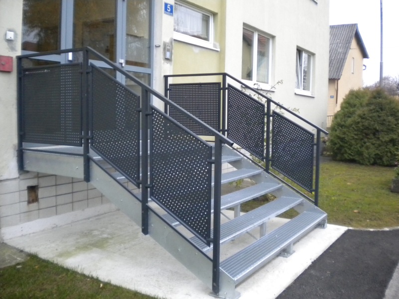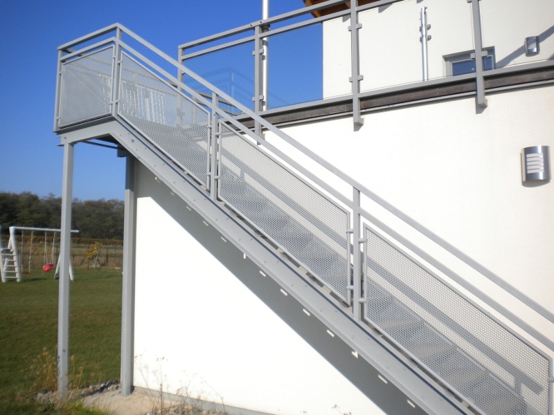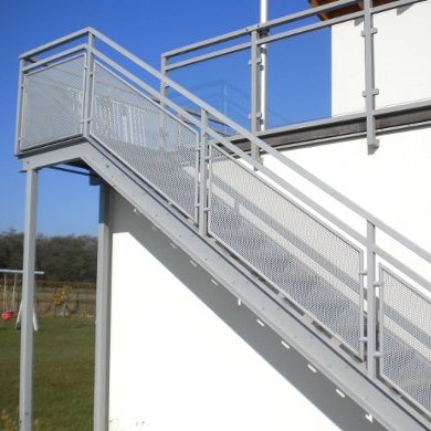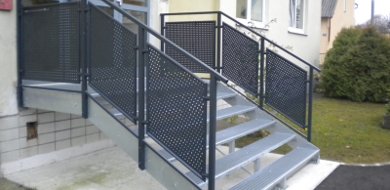 Stahlstiege mit Gitterroste und Geländer mit Lochblechen, umrandet mit Einfaßprofilen und befestigt mit Punkthaltern.