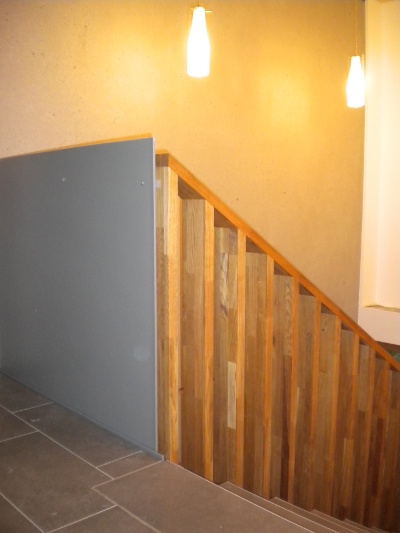 Moderne Blechgeländerkonstruktion, kombiniert mit Holz
