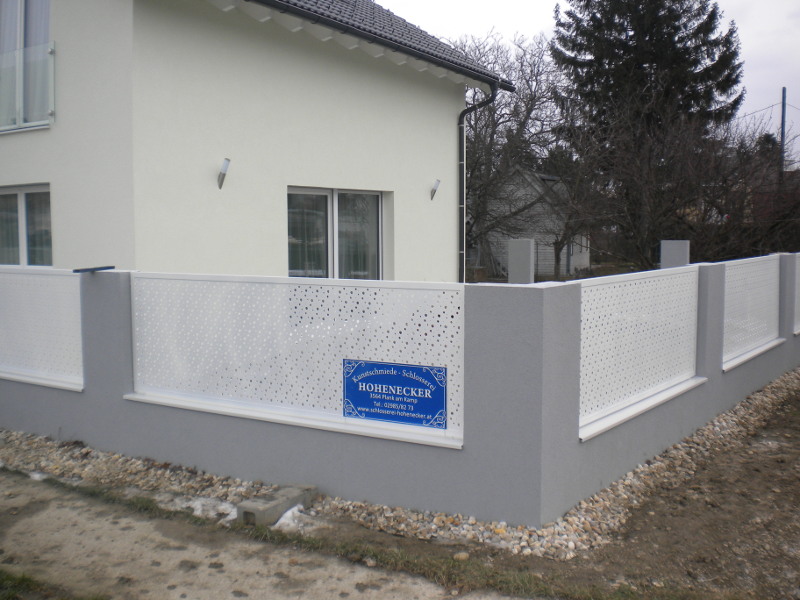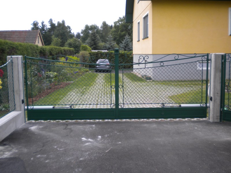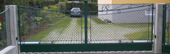 Unsere Produktpalette reicht vom moderen Schiebetor mit Lochblechelementen bis zum eleganten schmiedeeisenen Tor. (Auf Wunsch natürlich mit einem elekrischen Torantrieb zu öffnen.)